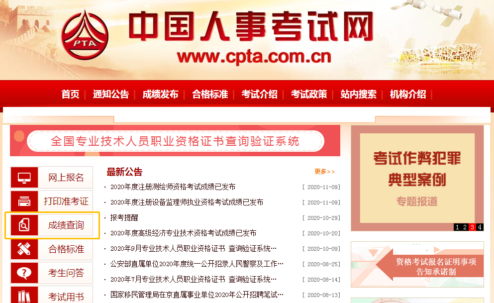 2、點擊中國人事考試網(wǎng)首頁左側(cè)導(dǎo)航中的“成績查詢”,如下圖: