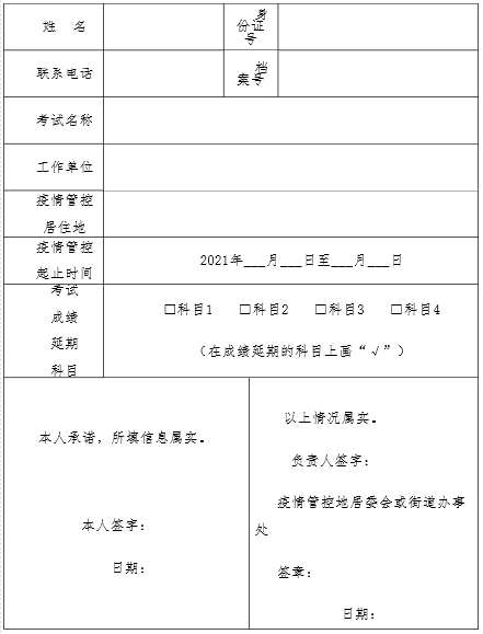 相關考生須提供有效身份證件復印件、準考證、成績單和疫情管控有關證明材料并按要求填寫《因疫情管控考試成績延期申請表》(見附件)。