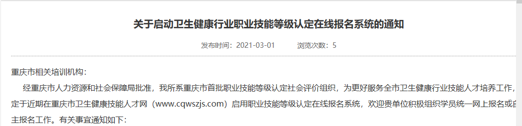 關于啟動2021年重慶衛生健康行業職業技能等級認定在線報名系統的通知
