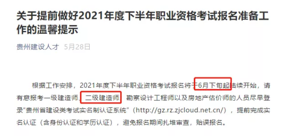 貴州住建部官方微信“貴州建設人才”指出,貴州2021年一級建造師、二級建造師等考試報名工作將于2021年6月下旬陸續開始: