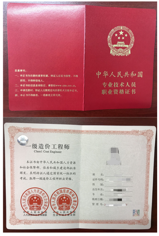 一級(jí)造價(jià)工程師證書(shū)職業(yè)資格證書(shū)樣例